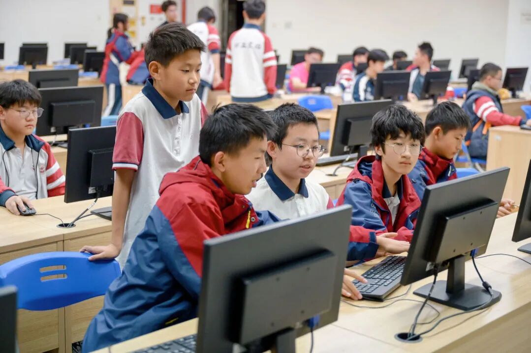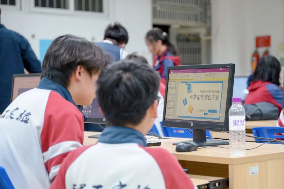 在计算机教室,同学们根据研学学习和参观的内容,以小组形式选取研究项目,集中讨论,分工明确,最终形成PPT成果展示。