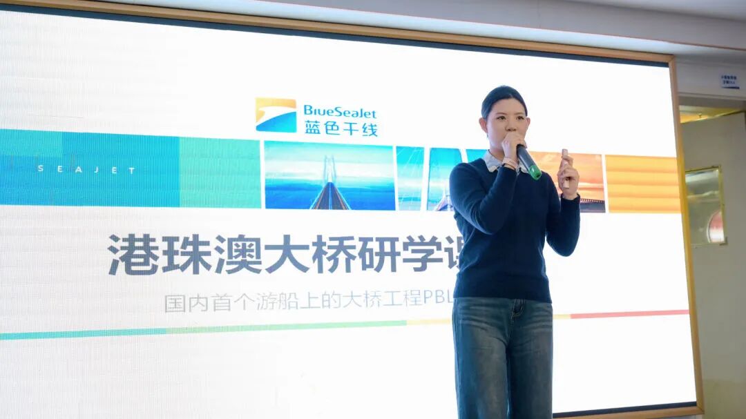 同学们登上“哪吒号”邮轮,从九州港出发,向着港珠澳大桥驶去。当这座横跨珠江口的“海上长城”如巨龙般出现在海平线上时,甲板上响起阵阵惊叹。随行导师详细讲解了大桥的建设历程。学生们自发唱起《我和我的祖国》,年轻的歌声与海浪声交织共鸣,家国情怀在这一刻具象化为眼前的震撼风景。