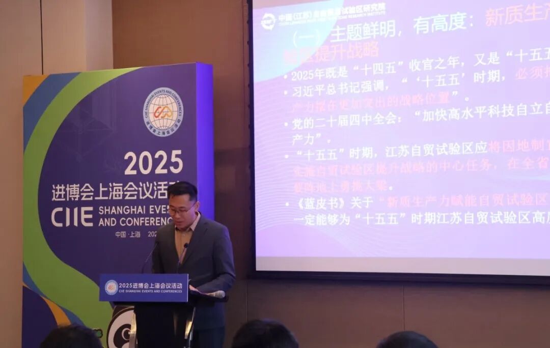 在成果发布环节,江苏省社会科学院《江海学刊》杂志社副主编战炤磊发布《中国(江苏)自由贸易试验区建设发展蓝皮书2025》。作为研究院连续四年发布的系列成果,该蓝皮书以“新质生产力赋能自贸试验区提升战略”为主题,采用1+10框架结构。“1”是导论部分,从总体上研究自贸试验区发展新质生产力的理论逻辑和战略取向,“10”是分论部分,聚焦发展新质生产力的关键环节、重点领域和堵点卡点,为“十五五期间江苏自贸试验区因地制宜发展新质生产力提供理论参考与实践路径。