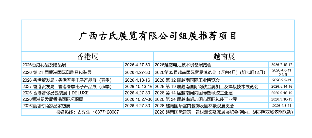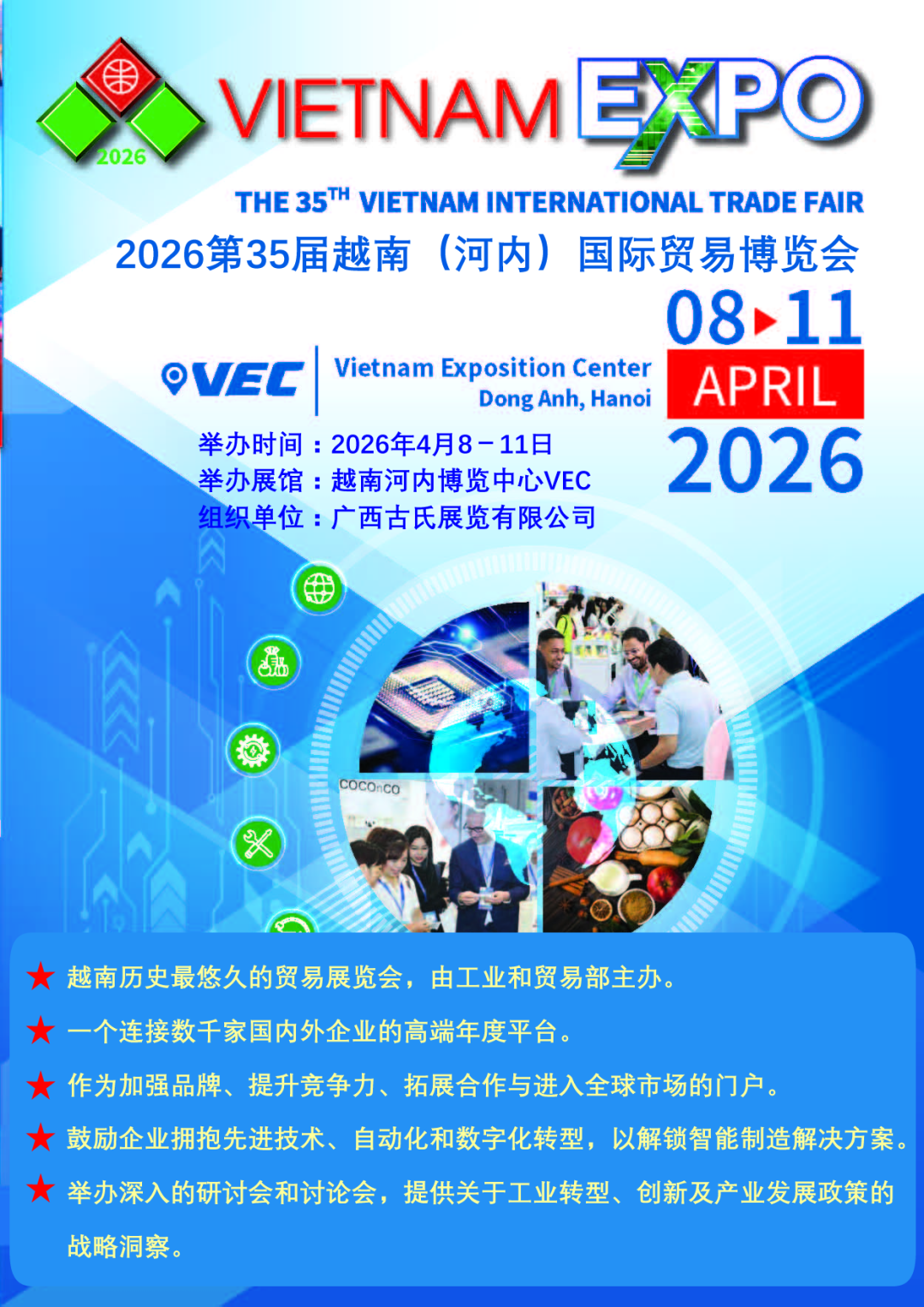 展会全称:第 35 届越南国际贸易博览会(THE 35TH VIETNAM INTERNATIONAL TRADE FAIR – VIETNAM EXPO 2026)举办时间:2026 年 4 月 8 日至 11 日举办地点:越南河内国家博览中心(Vietnam Exposition Center, VEC),位于河内市东英郡东会坊主办单位:越南工贸部(Ministry of Industry and Trade of Vietnam)指导单位:越南贸易促进局(Vietnam Trade Promotion Agency, VIETRADE)承办单位:VINEXAD 国家贸易展览与广告股份公司中国组展单位:广西古氏展览有限公司(古先生 183--7712--8087)展会主题:"VIETNAM EXPO 2026 – STEP TOGETHER IN DIGITIZED WORLD"(携手迈向数字化世界)展会历史:自 1991 年创办,是越南历史最悠久的年度贸易促进活动,至今已成功举办 34 届,成为越南及东盟地区极具影响力的国际贸易平台