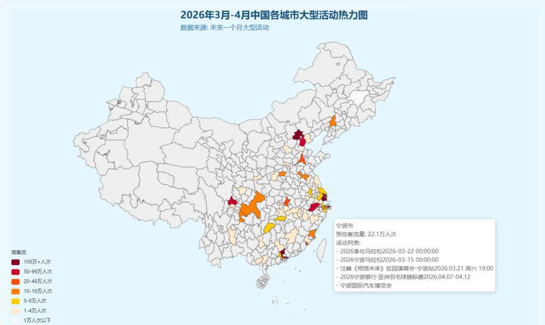 本报告涵盖2026年3月9日至4月9日期间,全国范围内举办的各类大型活动共计144场,包括:展会、体育赛事、中国马拉松、演唱会、网红IP、地方节假日,这些活动分布于全国多个省市,涉及交通枢纽城市、旅游目的地及文化节庆地,预计将引发大规模人员流动,影响范围广泛。