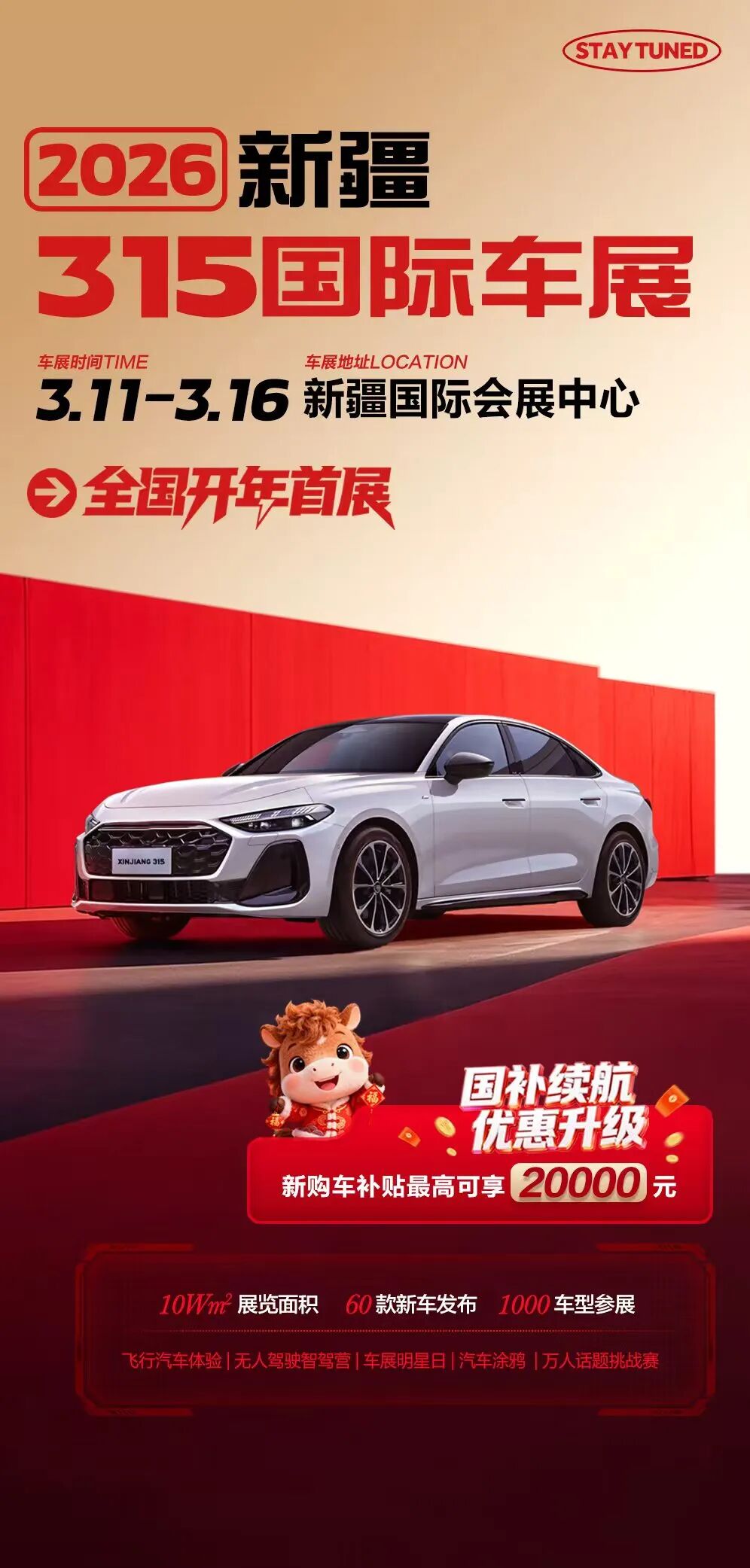 2026新疆315国际车展将于3月11—16日在新疆国际会展中心盛大开幕!组委会将秉承着为造车人服务、为售车人服务、为购车人服务的办展理念精神,努力为观众营造更精彩、安全安心的逛展环境,为参展商营造更精准高效的交易平台。