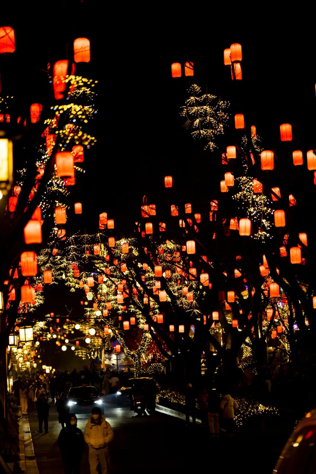 红灯笼在树上高高挂起,夕影渐沉,夜色初临,百年古道充满了年的气息。