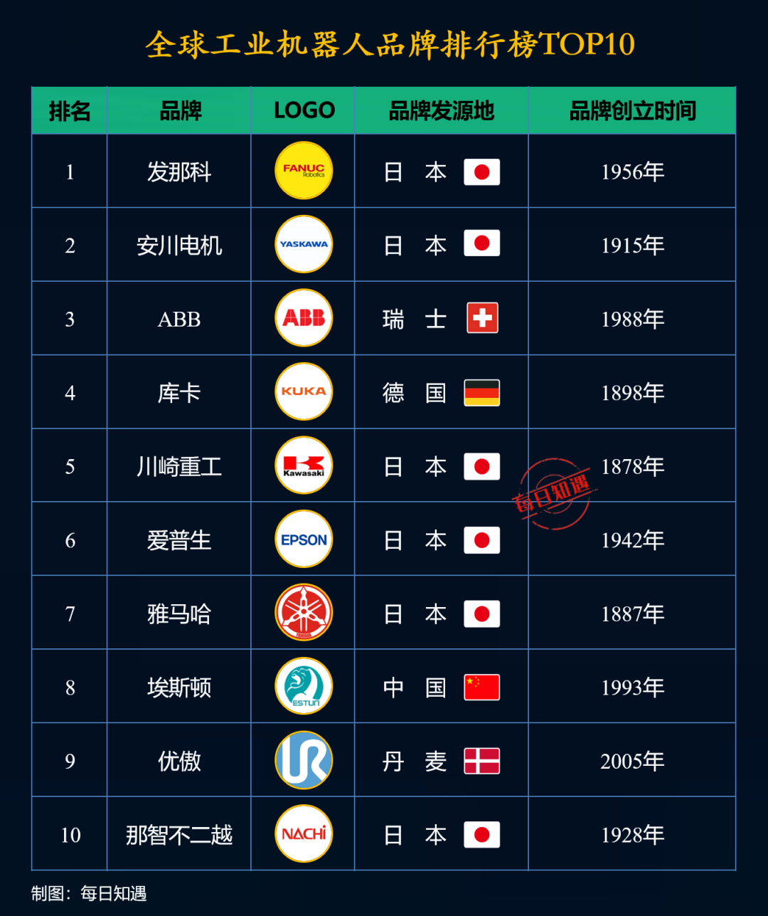 工业机器人是广泛用于工业领域的多关节机械手或多自由度的机器装置,具有一定的自动性,可依靠自身的动力能源和控制能力实现各种工业加工制造功能。目前,全球工业机器人市场主要由日本、欧洲等国家品牌主导,其中就包括发那科(日本)、安川电机(日本)、ABB(瑞士)、库卡(德国)四大工业机器人巨头。2025年全球工业机器人品牌排行榜TOP10具体情况如下文所示: