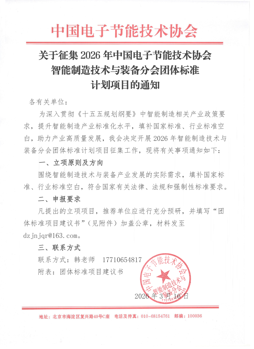 凡提出的立项项目,推荐单位应进行充分预研,并填写“团体标准项目建议书”(见附件)加盖公章,材料发至dzjnjqr@163.com。