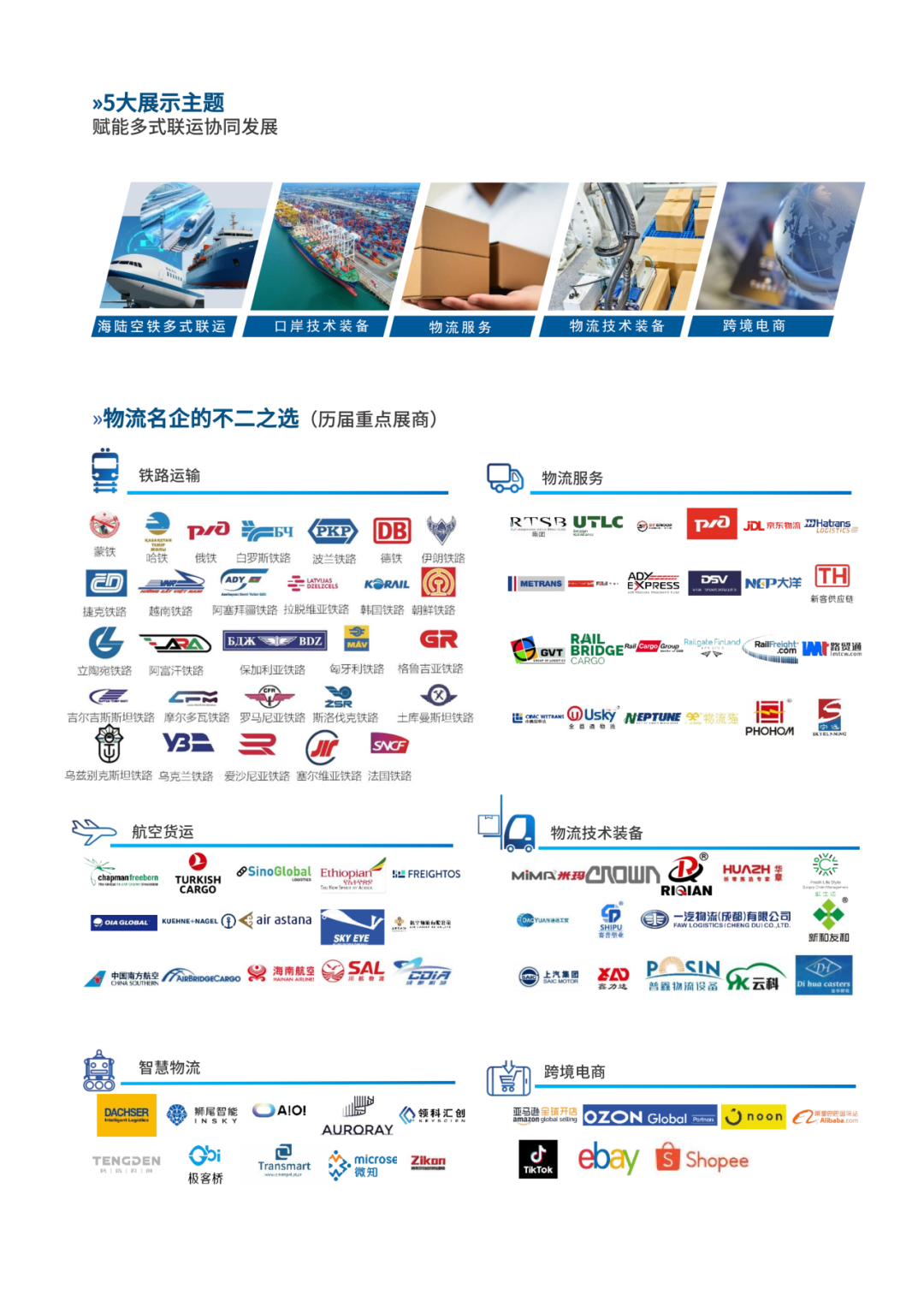 本届展会设置海陆空铁多式联运、口岸技术装备、物流服务、物流技术装备、跨境电商等五大核心展示主题,覆盖物流全产业链领域。