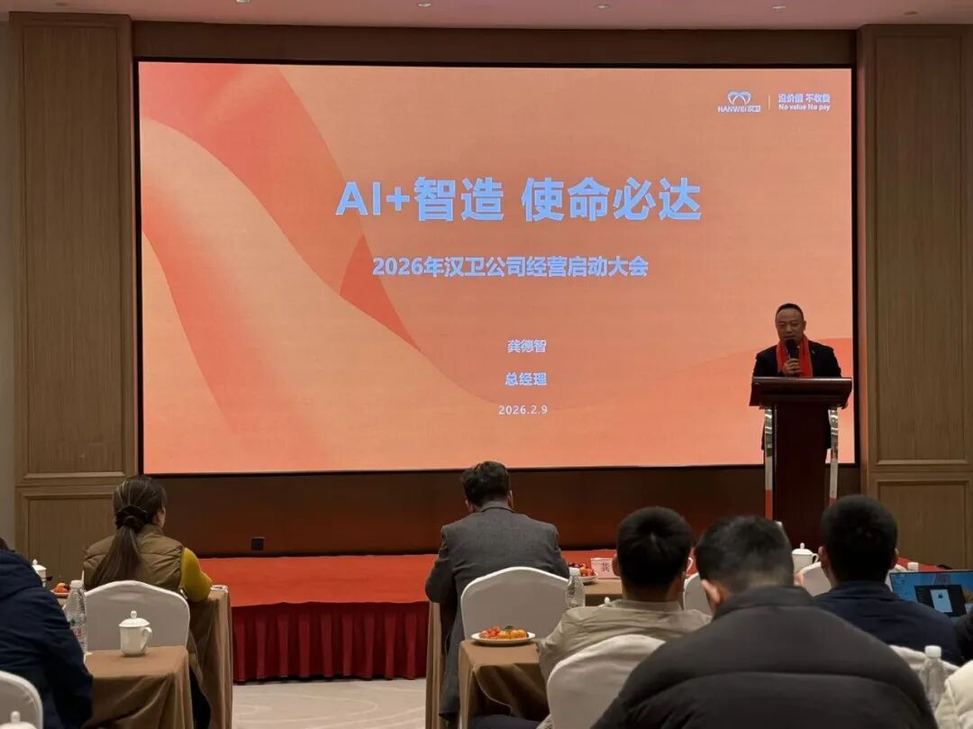 汉卫软件总经理龚德智先生作2026年汉卫公司战略规划报告,他首先感谢兄弟姐妹家人同事成就了汉卫的成长,也感谢选择相信汉卫的客户,是他们的信任成就了2025汉卫高速成长,更是感谢投资人刘总,使得2024-2025完成了首轮融资。回顾2025年的点滴,收获了很多荣誉,也肯定了2025年成绩,实现了公司业绩快速增长,云订阅服务成功转型。随后结合市场洞察,从公司五大创新焦点与战略意图,业务设计与组合,智能工厂标杆建设、公司愿景与价值观、汉卫品牌发展历程、未来三年战略方向,五大战役,企业文化等多维度提出了具体要求。未来三年,公司要下决心,大转型,用AI+智造,使命必达。最后附赠一首《致未来》小诗“金戈铁马征沙场,数智AI卷全球浪。汉卫立志赋工业,降本增效客户赞。”