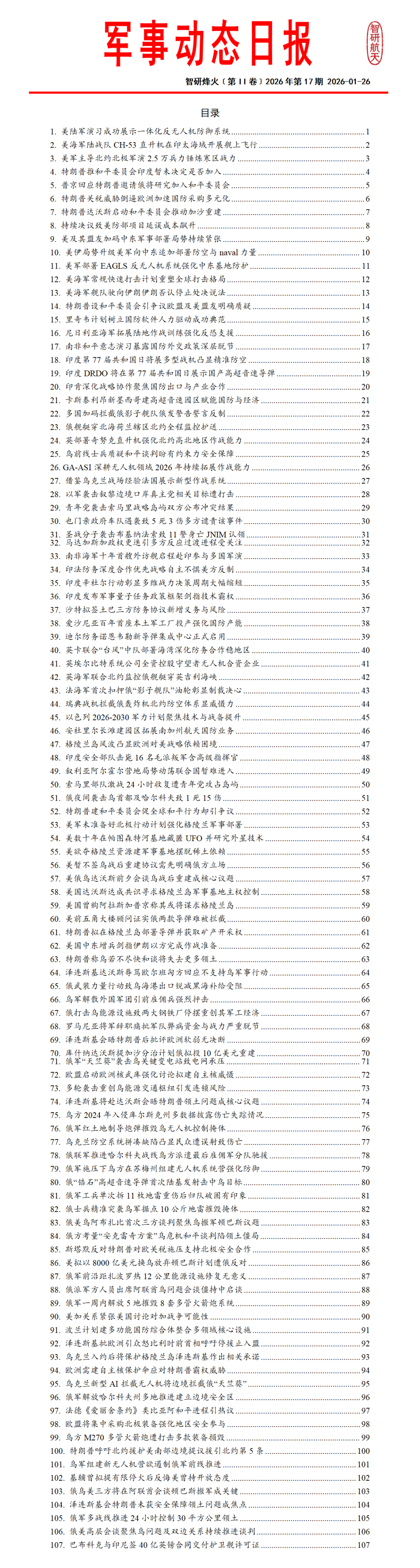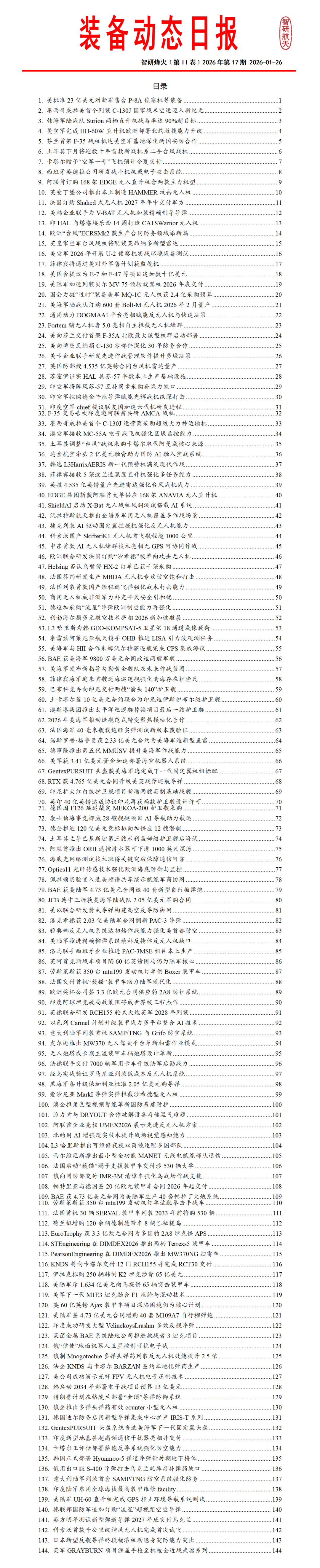 《全球防务动态》系列专刊国内独家每日发布涵盖航天领域、武器装备、军事热点、人工智能、先进制造等领域的全球动态信息。提供航天动态专报装备动态专报军事动态专报智造动态专报以及航天防务新闻日报等特色产品模块工作日每日推送,形成结构化、可编辑的文档,供订阅用户在小程序智研烽火信息商城下载。每日及时的动态信息能够有支持各单位进行报送、军情研究与安全形势分析的需求。