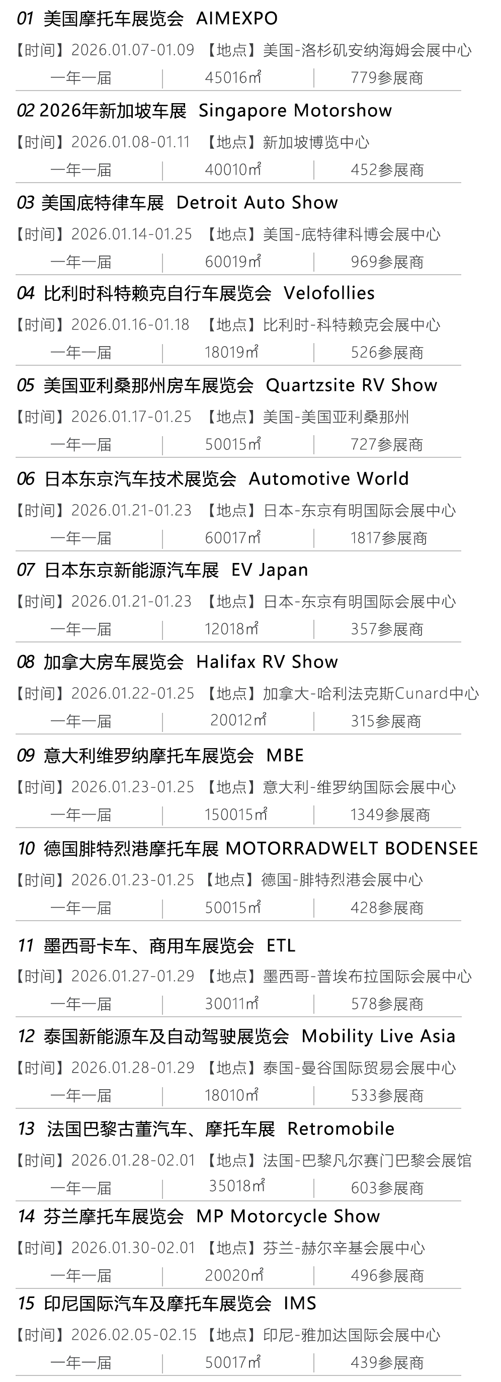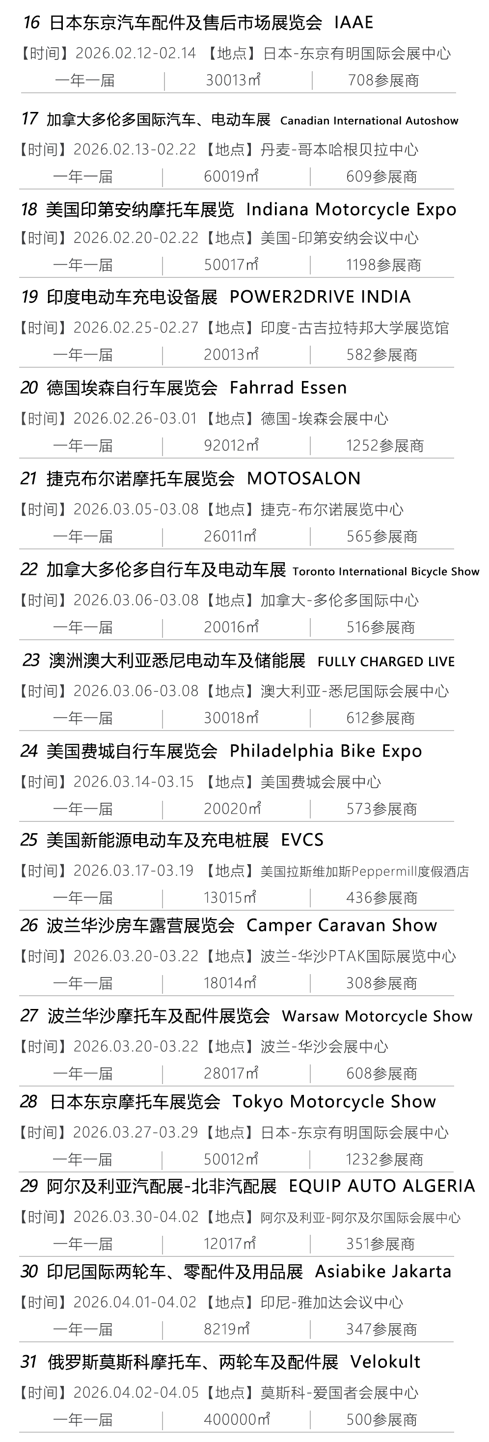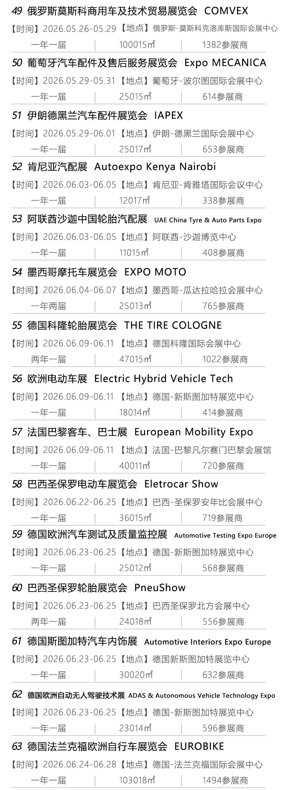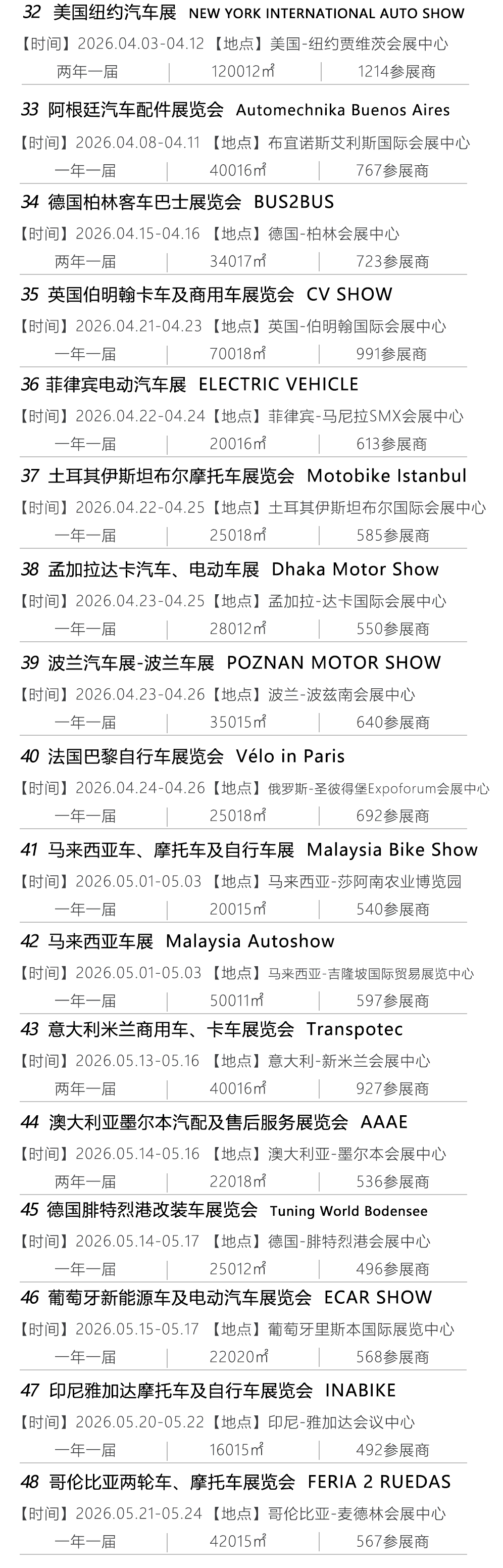 以上就是2026年上半年全球比较重要的车展会展,展会数量众多,内容仅供参考,具体开展时间以及相关信息还以主办方信息为主哦。