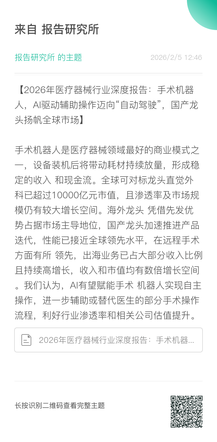 手术机器人定义:手术机器人是一种深度融合临床医学、精密机械、电子工程、计算机科学及人工智能等多学科技术的高端医疗 装备。在当前及可预见的临床实践框架内,其核心定位是作为外科医生的“智能增强工具”,通过人机协同显著提升手术的精准 度、微创性与安全性。从长远技术演进视角看,随着人工智能与自主决策能力的持续发展,手术机器人在特定标准化术式中承担 更多辅助乃至部分自主操作功能,已成为行业重要的探索方向。