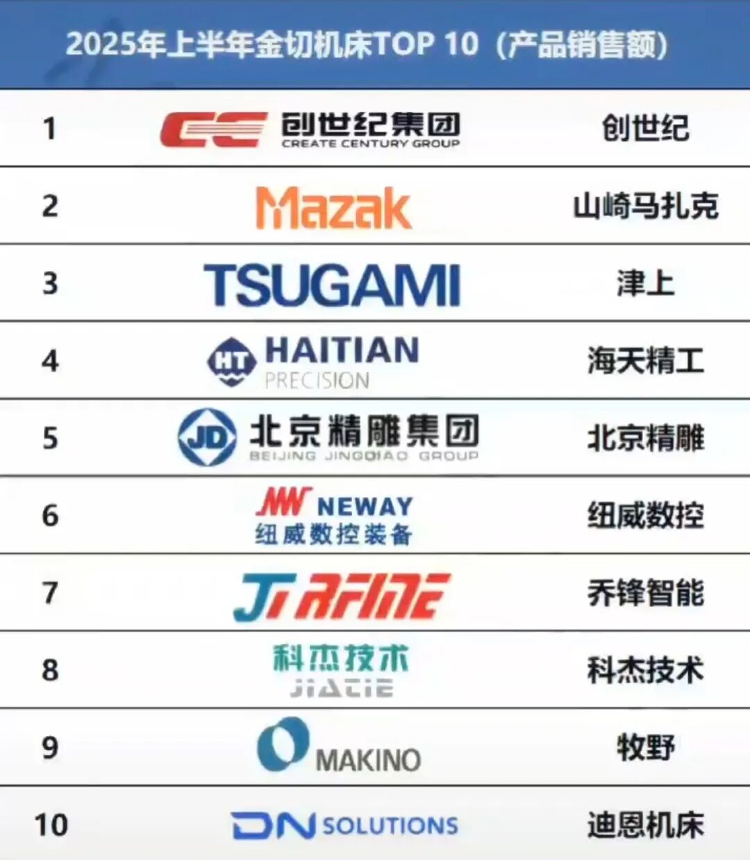 2025年上半年中国金属切削机床前10名厂商榜单发布,创世纪领跑