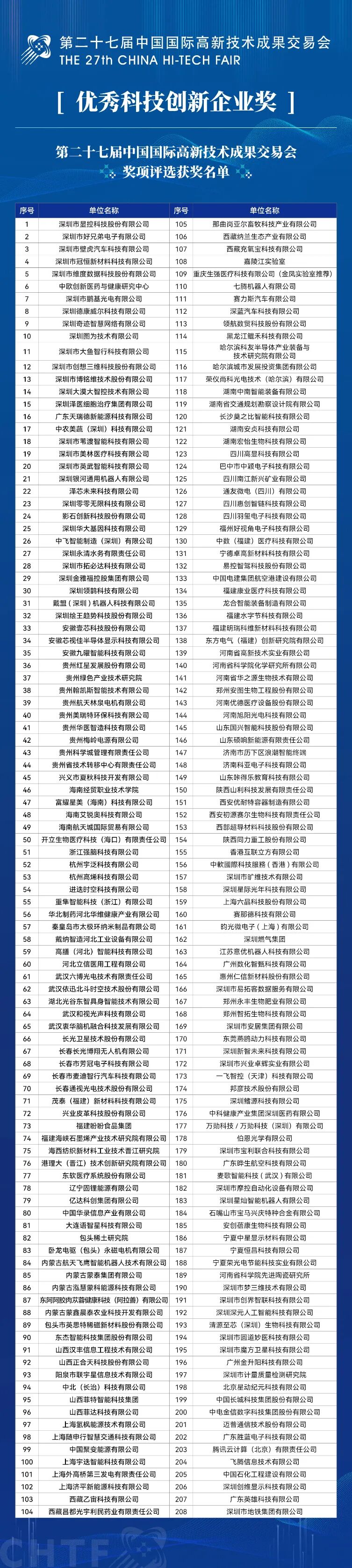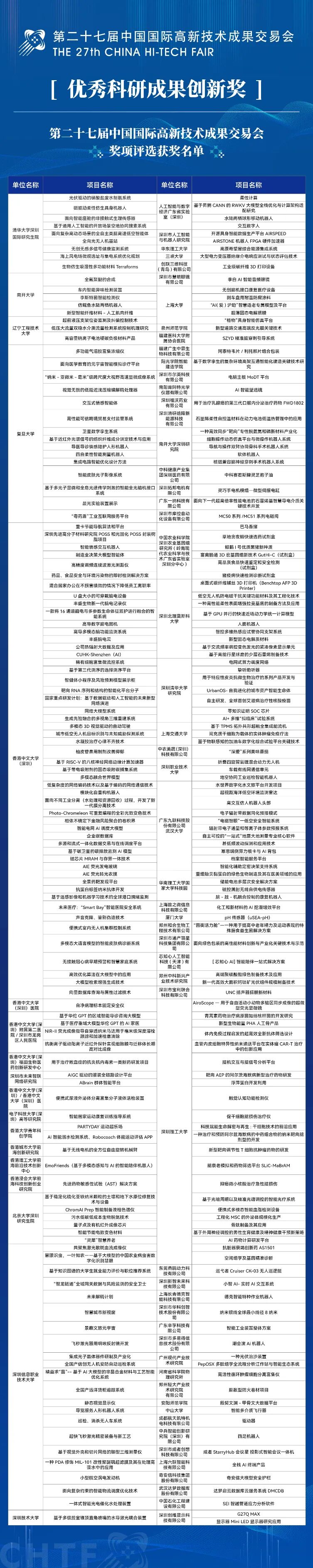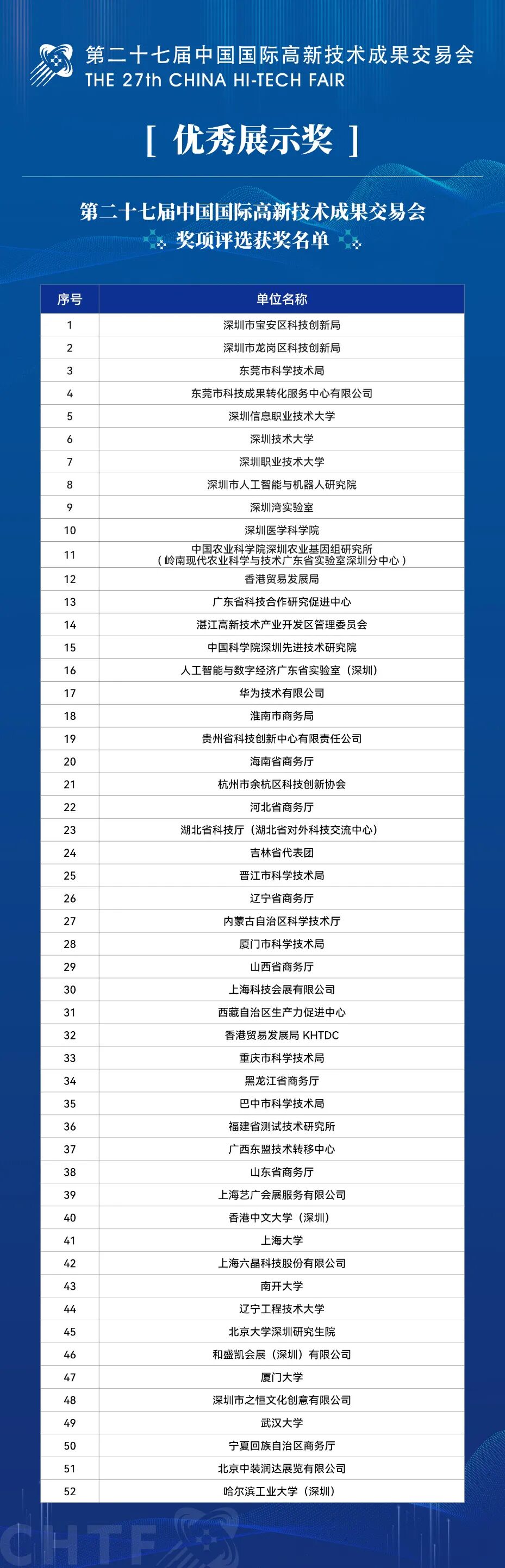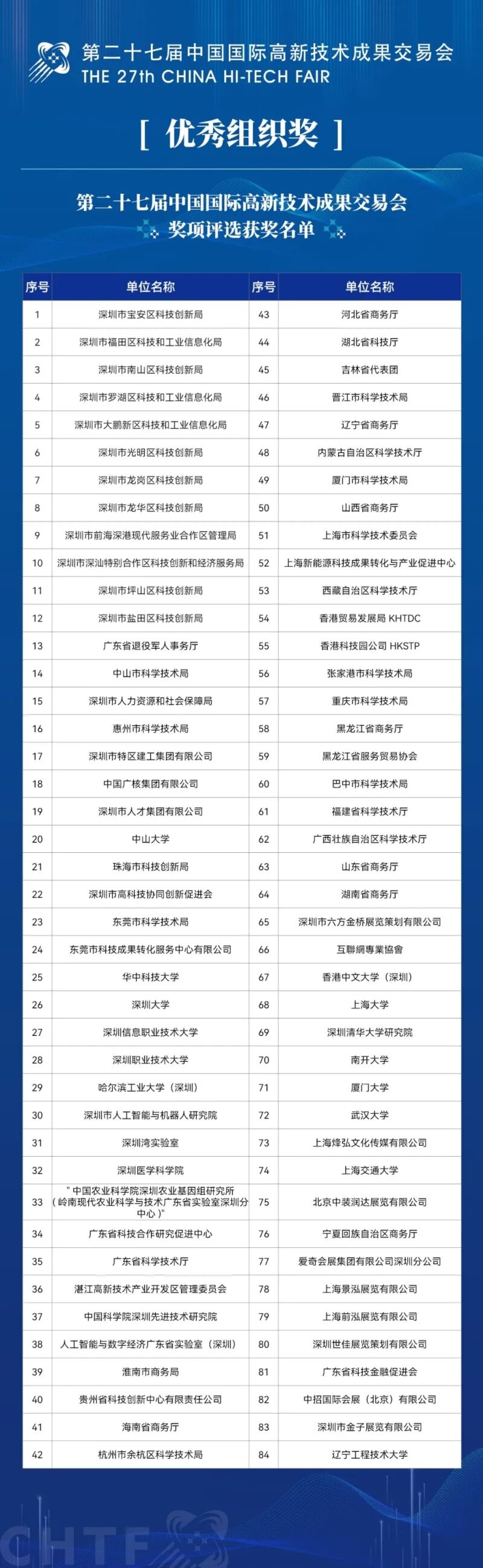 第二十七届中国国际高新技术成果交易会奖项评选活动的开展获得了各大单位机构的踊跃参与。高交会组委会办公室本着客观、公正、严谨的原则,遴选出了部分代表性单位机构,现将部分获奖名单予以公示。