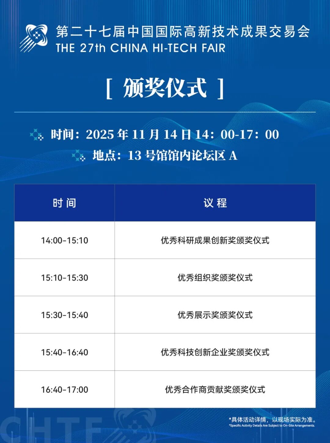此外,第二十七届中国国际高新技术成果交易会奖项评选活动的颁奖仪式和奖项定点领取安排如下。