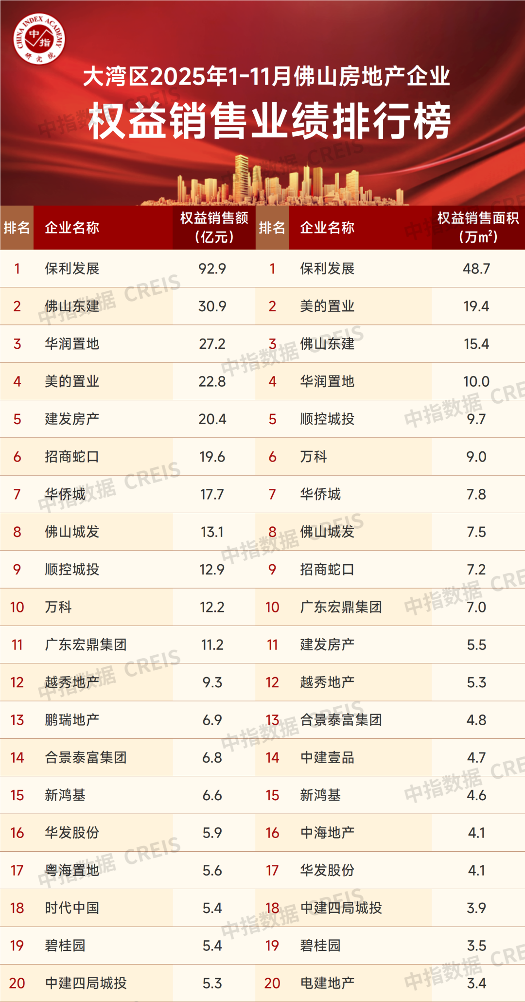 权益销售金额:2025年1-11月,保利华南、佛山东建、华润置地分别位居佛山房地产权益销售金额前3位,权益销售金额分别为92.9亿元、30.9亿元以及24.2亿元。前三名合计权益销售金额市占率达到27.6%。