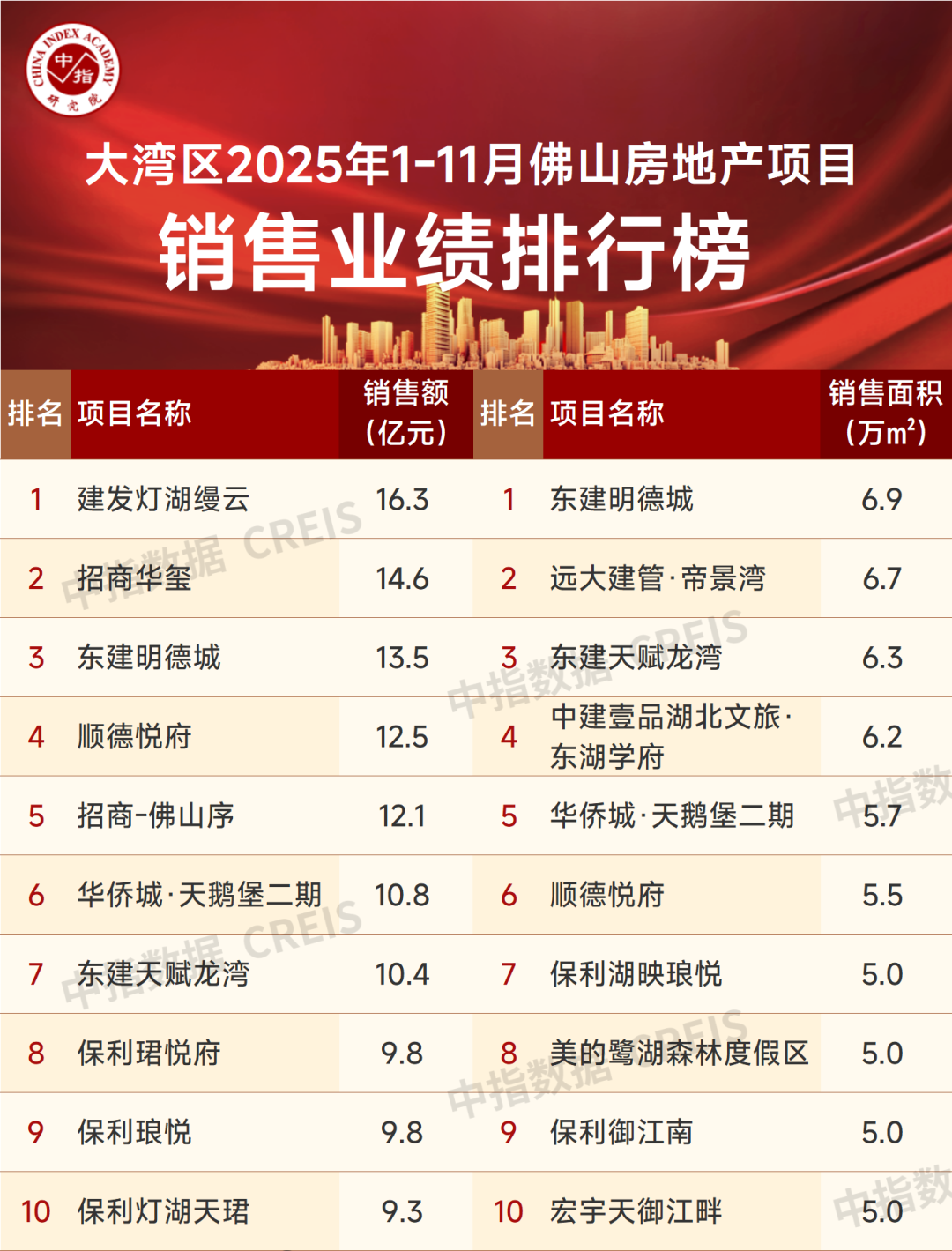 2025年1-11月佛山房地产项目销售金额前10的总销售金额为117.2亿元,门槛值为9.2亿元。前10项目合计销售金额市占率为21.9%。排名前3项目较1-10月榜单无变化,南海区泛千灯湖区域的改善型项目建发灯湖缦云以16.3亿元的销售额继续领跑全市;同板块内的招商华玺位居全市第二,销售额为14.6亿元;禅城区祖庙板块的东建明德城以13.5亿元的销售金额位居第三。共有7个项目销售金额超10亿元。