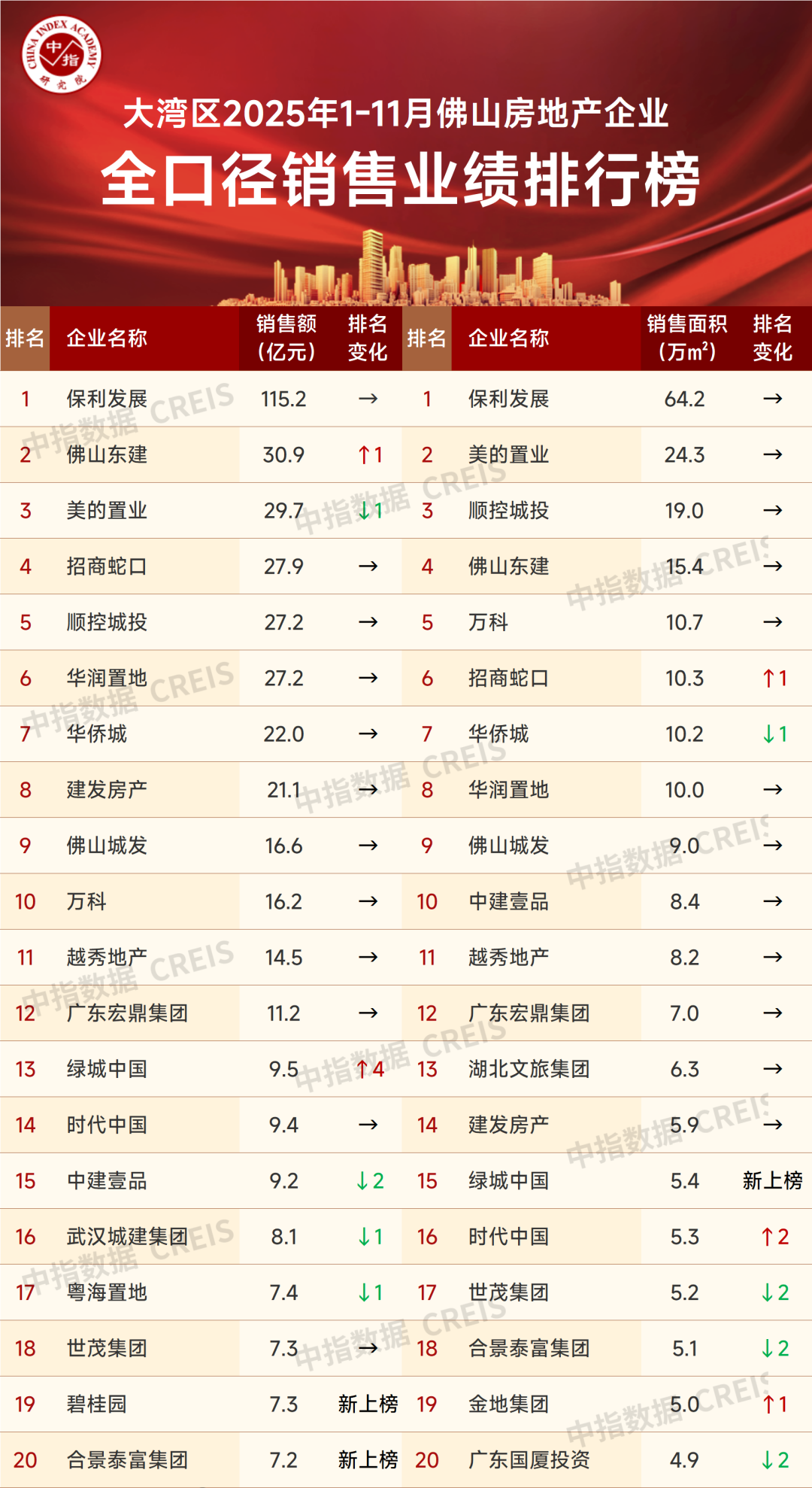 销售面积:2025年1-11月佛山房地产企业全口径销售面积TOP20企业合计销售240万㎡,入榜门槛值为4.9万㎡。保利发展、美的置业、顺控城投继续位列全市前三位,销售面积分别为64.2万㎡、24.3万㎡、19万㎡。排名变化上,与1-10月全口径销售面积排名相比,3家房企排名上升,5家下降,12家持平,1家新上榜。