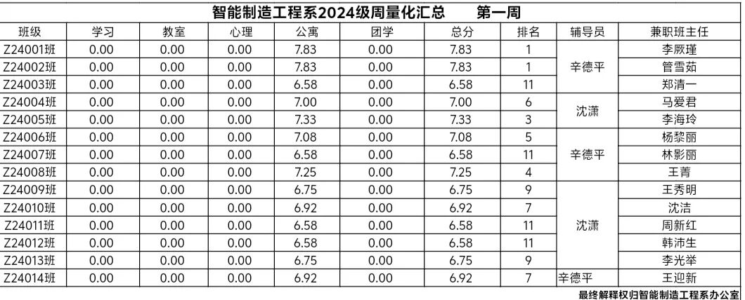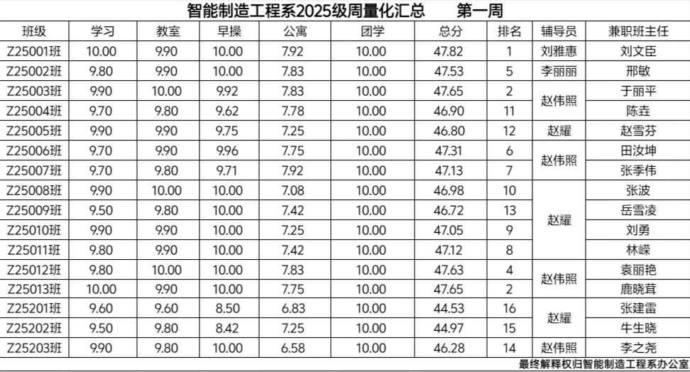 根据《智能制造工程系班级量化考核细则》,经综合评定,现将2025-2026学年第二学期第一周班级量化公式如下: