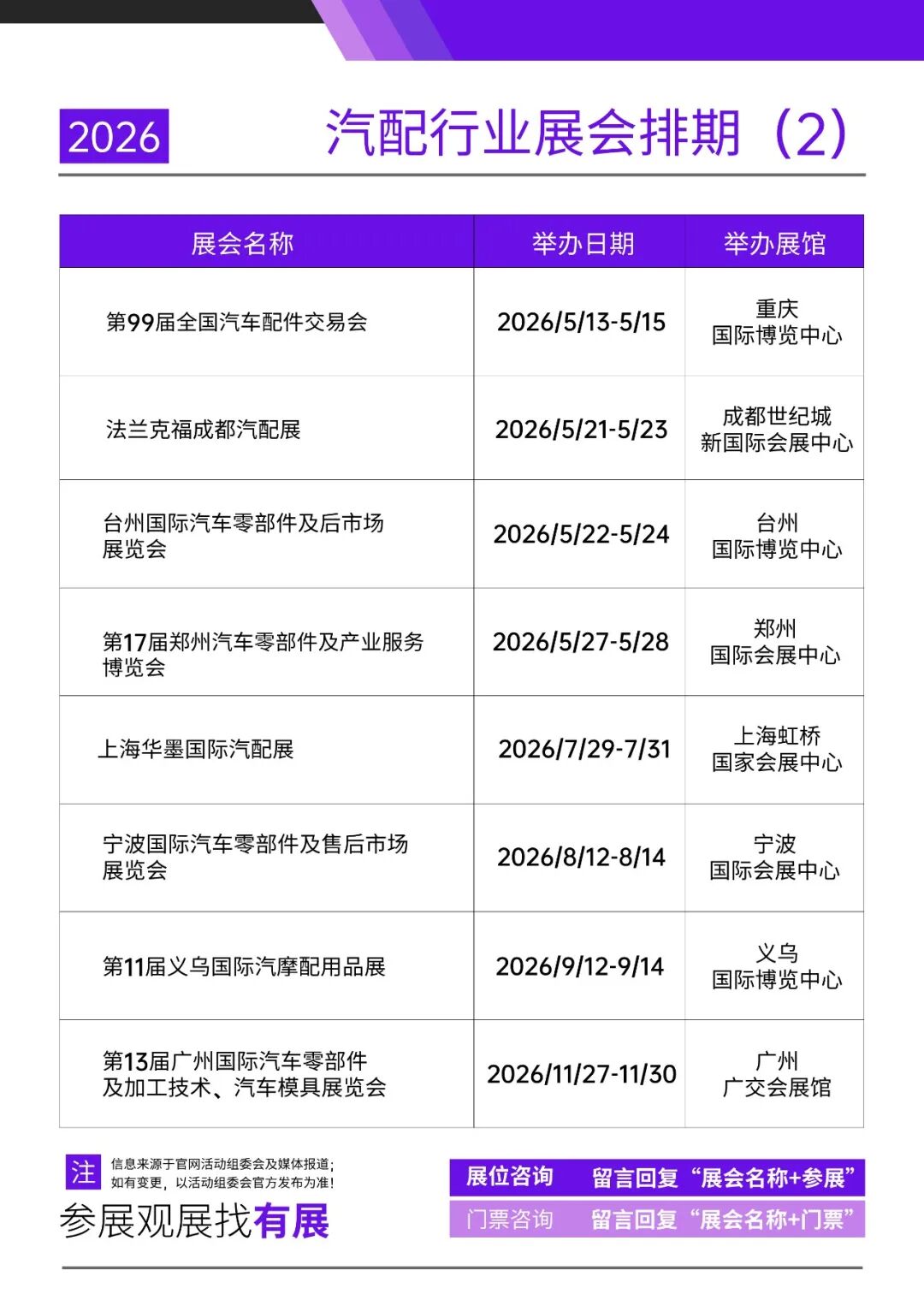 声明:展会排期信息来源于汽配展官网、公众号、活动组委会及媒体报道,展会时间、地点、规模等细节可能因主办方调整发生变化,具体以主办方最新公告为准。以上为有展网为大家整理的汽配行业展会排期,希望能为各位提供部分参考。