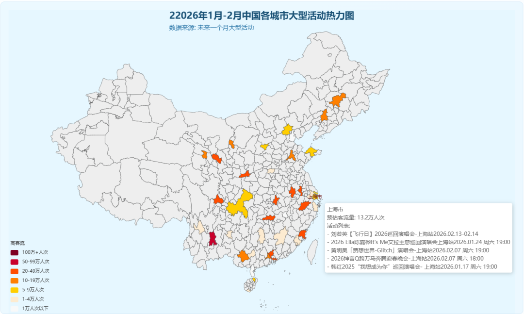 高峰期:1月30日–2月13日:年货展集中开展,覆盖全国多城。1月17日、1月24日、1月31日:演唱会集中爆发,多城同日开唱。