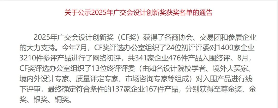广交会设计创新奖(CF奖)以“树立品质标杆,引导设计创新”为宗旨,依托广交会这一全球贸易平台,致力于评选和推广具有原创设计价值的中国出口产品。评选过程分为初评和终评两个环节,评审团队由境内外知名设计师、国际采购集团代表及质量专家等组成,从创新性、功能性、品质美感、人机工程、环保性等多个维度对参赛产品进行综合评估。