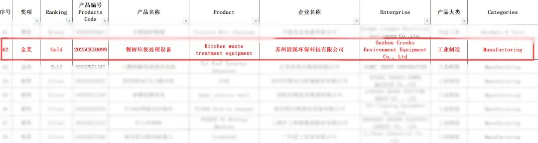 近日,2025年广交会设计创新奖(CF奖)获奖名单公布,苏州市环保产业协会理事单位苏州清溪环保科技有限公司自主研发的“餐厨垃圾处理设备”凭借卓越的创新设计和领先的技术水平,从1400家企业提交的3210件参评产品中脱颖而出,成功斩获金奖。本届CF奖竞争异常激烈,最终仅137家企业的167件产品获奖,其中全国仅25个产品获金奖及以上奖项,苏州占据两席,清溪环保成为高新区唯一获此殊荣的企业。