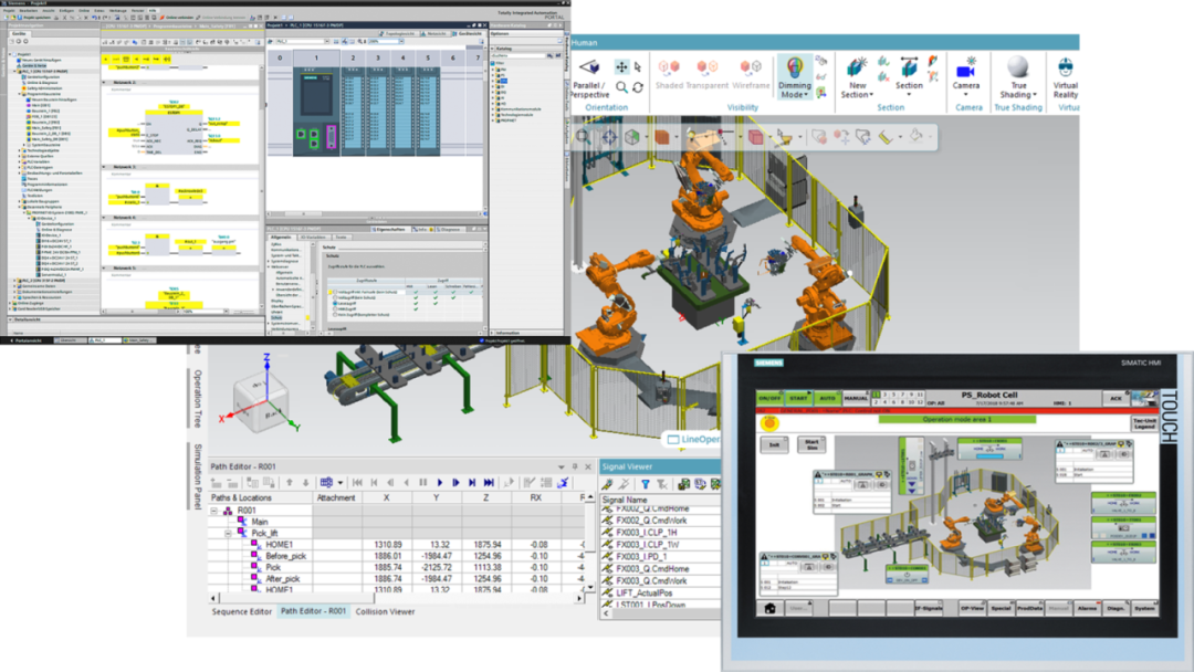 虚拟调试:通过虚拟调试技术验证机器人程序逻辑、验证产线PLC、HMI程序,提前验证,缩短产品调试试验时间,降低成本与风险。