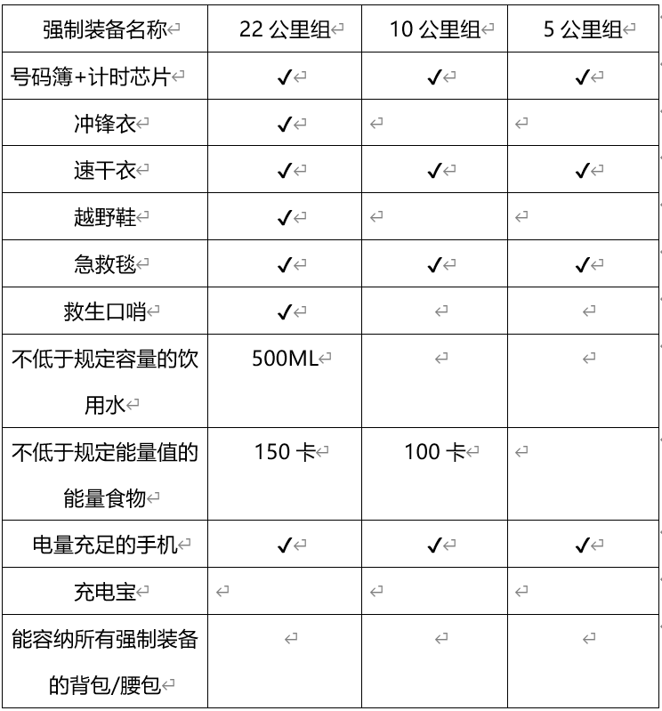 长跑活动是一项高强度、高风险的户外运动,对选手的装备有一定的要求,在起跑检录时将检查强制装备,缺少任何一件,将不给予进入起跑区。在活动期间,在各个检查站检查参赛包,强制装备不完整者将被终止参加活动。