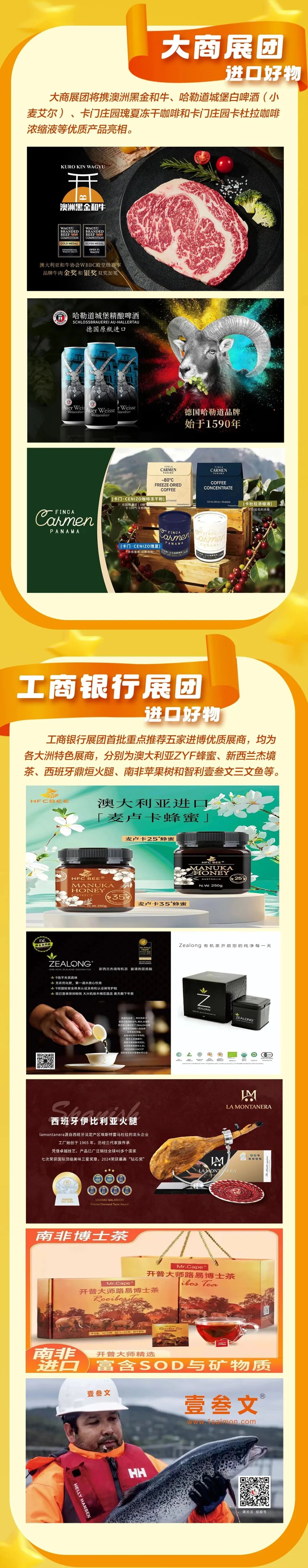 3H:主要展示农食产品、医药保健产品等。农食产品包含蔬果农产品、肉类、乳制品、饮料及酒类、休闲食品和综合食品等品类;医药保健产品包含营养素补充剂、非处方药、医疗器械、适老产品等品类,特设医疗科普区,重点呈现医疗公益服务、公共卫生知识普及、慢病防治科普等内容。另外,特设国别(地区)展团区域,将呈现加拿大、澳大利亚、瑞士、意大利、蒙古等特色产品。