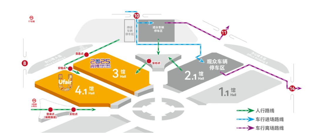 地铁:乘坐地铁2号线至国家会展中心站,由5号出口步行至展馆入口。或者乘坐地铁17号线至国家会展中心站,由15号口步行至展馆入口。
