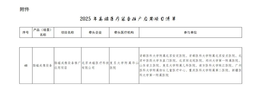 近日,工业和信息化部、国家卫生健康委、国家药品监督管理局三部门联合公布了2025年高端医疗装备推广应用项目清单,全国范围内共有57个顶尖项目入选。其中,已投企业未磁科技自主研发的脑磁成像设备入选2025年高端医疗装备推广应用项目,获得了国家层面的权威认可。