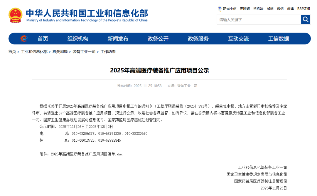 高端医疗装备推广应用项目”是由工信部、国家卫健委、国家药监局联合开展的一项工作,旨在面向高端医疗装备重点产品和典型场景,遴选一批技术创新水平与临床应用水平处于全国前列,对医工协同创新、中试验证、临床研究、迭代升级与推广应用等具有较强引领带动作用的项目。