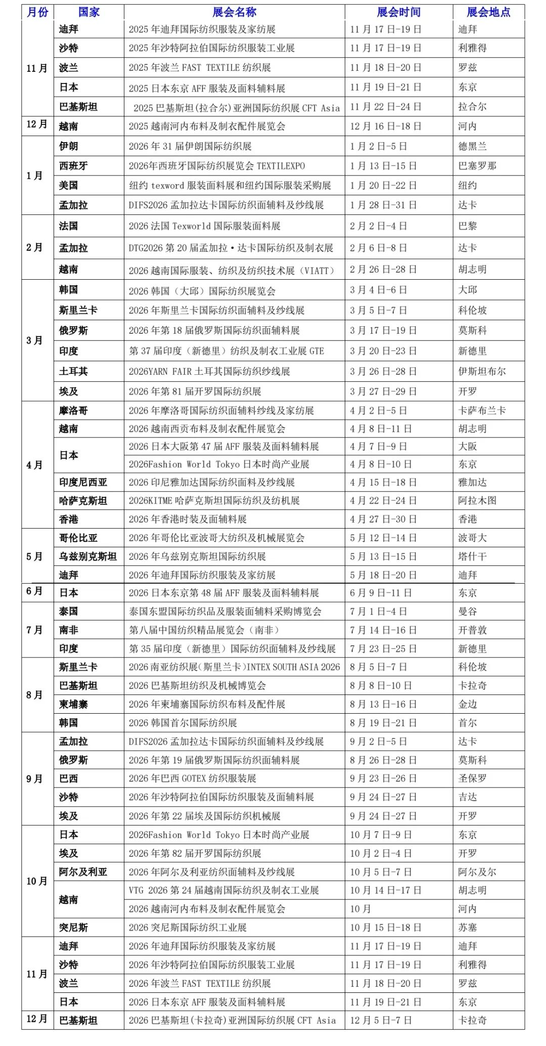 巴基斯坦:在卡拉奇和拉合尔等地有多次展会(如2025年11月、2026年8月及12月),突出其棉纺产业优势。