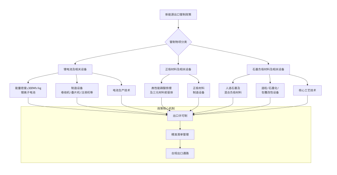 • 上游材料:从锂矿加工到正极 / 负极材料生产,管制物项贯穿原材料端。例如,中国供应全球 70% 的电池材料,人造石墨负极材料出口占比超 80%