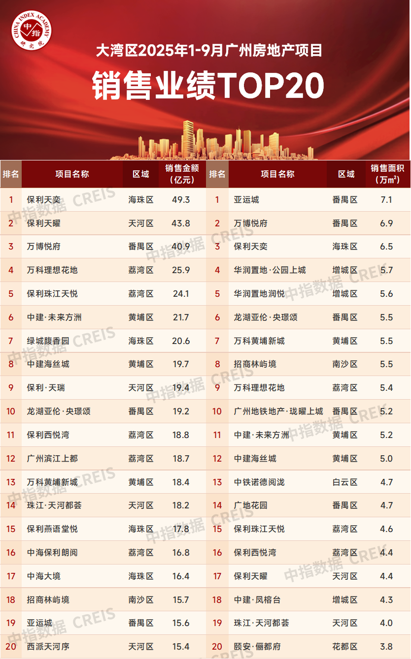 2025年1-9月广州房地产项目销售金额前20门槛值为15.4亿元。其中海珠区保利天奕以49.3亿元的网签金额位居榜首;天河区改善项目保利天曜以43.8亿元网签金额位居榜单第二;番禺区热销项目万博悦府以40.9亿元位居榜单第三。