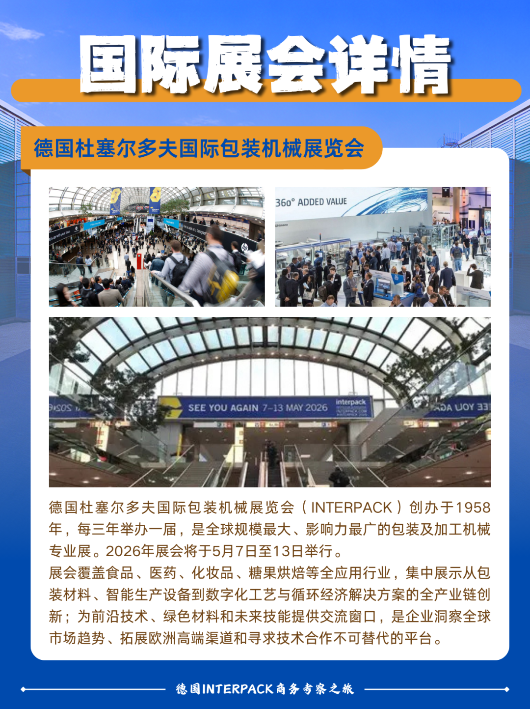 🔎 5月正是欧洲工业盛会季!本次3年1届的考察团,直击全球规模最大的包装展——INTERPACK 2026,汇聚全球顶尖包装机械、新材料与数字化解决方案!