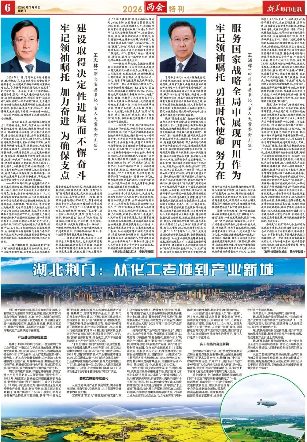 3月8日,《新华每日电讯》刊发四川省委书记、省人大常委会主任王晓晖署名文章《牢记领袖嘱托 勇担时代使命 努力在服务国家战略全局中展现四川作为》。
