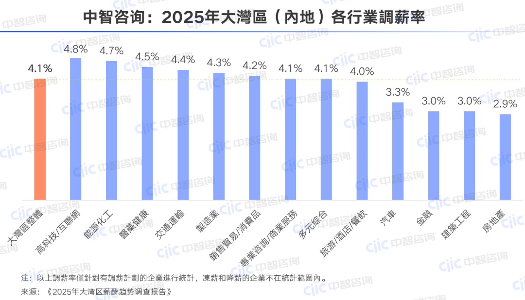 2025年九个大湾区城市企业调薪率平均为4.1%,较2024年下跌0.7个百分点;