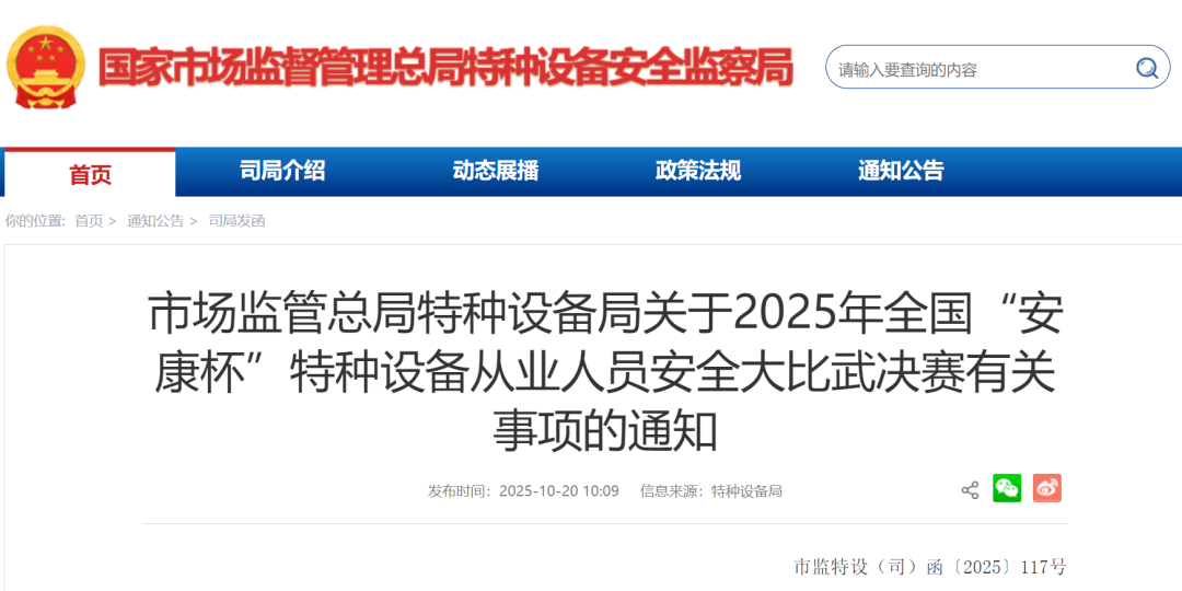 消息来源:“国家市场监督管理总局特种设备安全监察局”网站