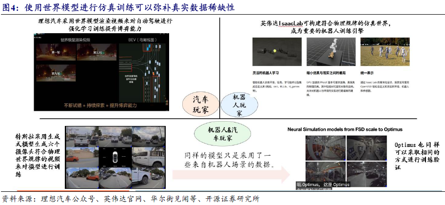 近年来,世界模型等新兴技术开始出现,用于搭建虚拟环境,以便算法在其中进行反复的试错与强化训练,从而达到最优的运行效果。而这样的数据基建体系,对于机器人技术而言同样适用:以仿真环节为例,理想汽车已经借助世界模型对其智驾算法开展强化训练,在机器人领域,英伟达的 IssacLab 也能为机器人提供符合物理世界规律的仿真环境,便于机器人进行训练;特斯拉在最新的技术分享中也提到,通过同一套生成式模型,仅切换训练数据,就能同时实现对汽车与机器人的算法训练。由此可见,两者在数据基建层面的复用度与技术同源性都较高。我们认为,当机器人技术真正迈向实用化阶段时,工程化能力的重要性也将愈发突出,因为在实际应用场景中,系统的稳定性、可靠性等都是关键的核心要素。