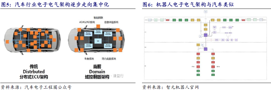 在电子电气架构领域,汽车行业目前已基本形成了集中式的技术方案,并且正逐步向中央计算平台的方向演进;由于汽车所搭载的执行器种类较为丰富,不同功能领域通常会通过对应的域控制器来进行管理。而机器人系统通常需要实现语音交互、语义理解、动作执行等功能,因此其控制单元也包含 GPU、MCU、CPU 等硬件组件,同时机器人同样涉及感知 - 决策 - 执行的技术链路,所以在电子电气架构层面,两者之间具备充分的技术可借鉴性。在热管理领域,汽车行业经过多年的发展,已经形成了成熟完备的解决方案,而机器人领域目前仍受散热问题的困扰,因此两者在这一领域也存在不少可以相互借鉴的内容。