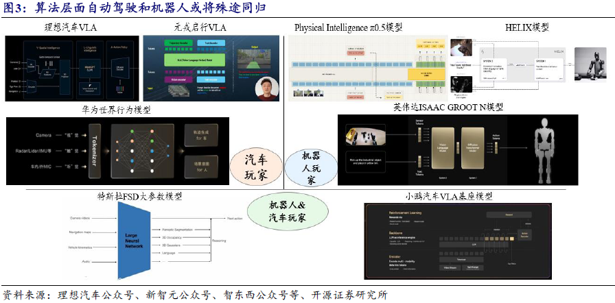 在算法层面,机器人与自动驾驶技术的发展路径正日渐趋同。行业内的技术方案已基本集中于多模态大型端到端神经网络以及 VLA 模型等方向,在功能层面则力求同时具备 “系统 1” 与 “系统 2” 对应的快速反应和深度思考能力。正因如此,两者在模型的构建思路以及需要解决的核心问题上,重叠度正不断提升。从具体的算法路线来看,理想汽车、元戎启行等企业选择了 VLA 技术路线,还有部分智驾领域的参与者采用了端到端 + VLM 的方案;而在机器人领域,无论是 Physical Intelligence 还是 Figure 等企业,也在积极布局 VLA 以及具备快慢思考能力的算法,特斯拉则采用了大型多模态模型,同时融入了推理功能。至此,机器人与智驾技术在算法层面实现了技术交汇。