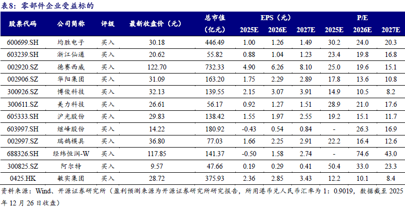 汽车零部件企业拥有 “规模化降本 + 质量管控” 的体系化竞争优势,不少零部件企业已前瞻性地布局机器人产业。汽车与机器人行业存在大量共同的供应商,这也就意味着汽车产业的部分供应链资源可以直接应用于人形机器人的开发工作,依托技术同源性推动产业层面的协同创新。凭借强劲的研发实力、先进的制造能力以及丰富的量产经验,车企在人形机器人的研发与制造过程中,具备较为显著的先发优势。汽车零部件企业拥有精密加工设备的规模化应用经验,能够快速推进机器人零部件的研发与制造迭代;同时,当车企布局人形机器人业务时,与其有着稳固且成熟合作关系的汽车零部件企业有望率先获得发展机遇,这些相关零部件企业也有望借此切入新赛道,实现业务的二次增长。