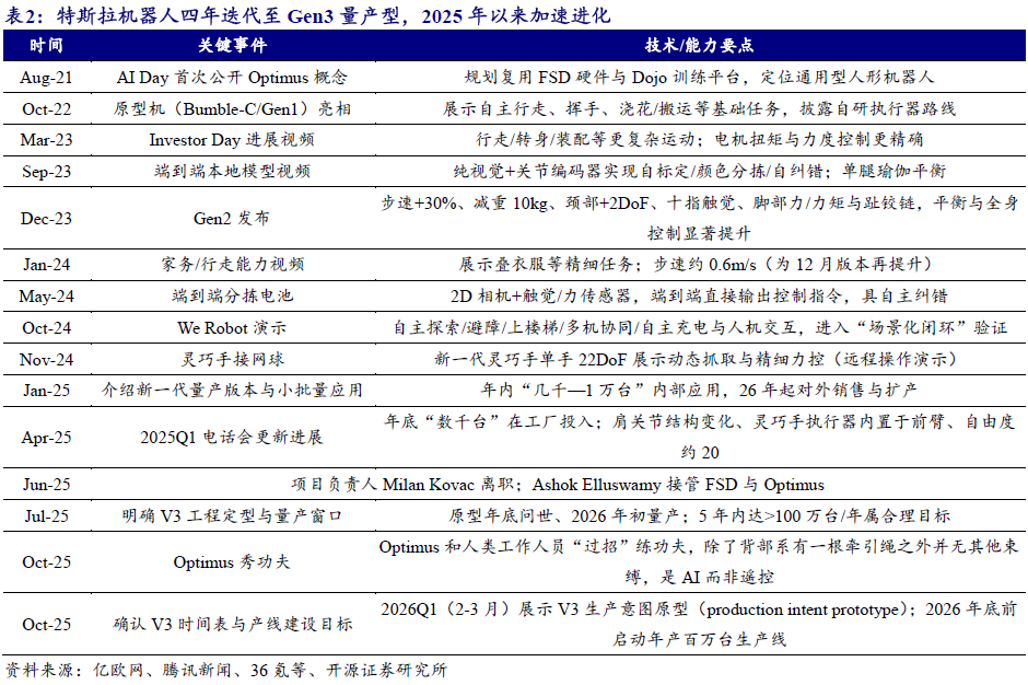 汽车产线的经验向机器人产线迁移复制,其量产规划的雄心凸显出行业的广阔蓝图。特斯拉并未将 Optimus 停留在实验室概念阶段,公司已明确计划于 2026 年第一季度(2-3 月)展示具备量产意图的 Gen3(V3)原型机,并着手规划建设年产百万台级别的生产线;后续 V4 将实现 1000 万台的产能,V5 甚至可能达到 5000 万到 1 亿台的产能规模。这一激进的时间表与规模目标,远超外界早期预期,凸显了特斯拉意图将人形机器人打造为继电动汽车之后又一核心支柱产业的战略野心。