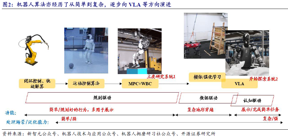 从整体来看,机器人的发展也经历了从规则驱动到数据驱动、再到认知驱动的过程,算法模型的泛化能力持续增强,其功能也从简单的、预先规划好的动作,逐步升级为能够完成复杂地形穿越、执行简单任务等更丰富的能力。