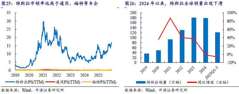 特斯拉长期以来都对标科技股进行估值:2021-2022 年,其市销率多数时段处于 15 倍以上;2023 年因营收增长导致市销率大幅回落的阶段,仍稳定在 5 倍以上;2024 年以来即便销量有所下滑,市销率依旧从底部区间波动回升,近期更是突破了 15 倍。