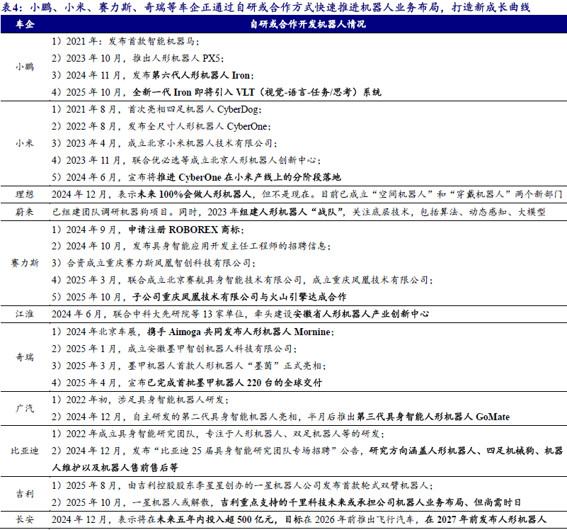 • (2)资本运作实现轻量化布局:相比全自研模式,战略投资或许是投入产出比更高的举措之一。如上汽投资团队曾表示,投资智元机器人比自建产线快 18 个月,还能规避 30% 的技术风险。
