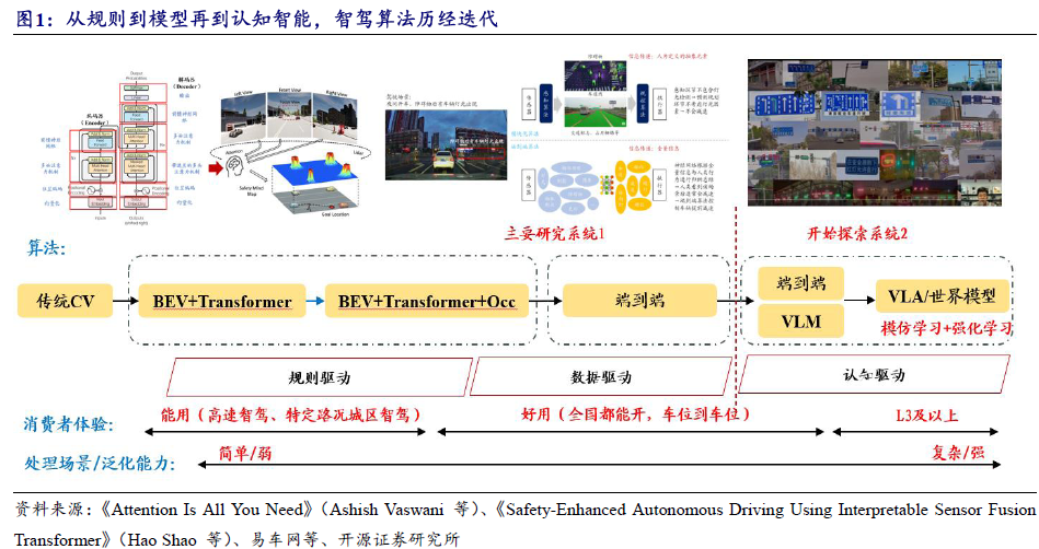 同样在 2025 年,行业内的参与者也从仅通过端到端方式训练 “系统 1”,逐渐转向借助强大的多模态模型来构建算法的 “系统 2” 能力,同时将模仿学习与强化学习相结合,通过世界模型搭建虚拟环境,助力智驾突破性能边界。近期,特斯拉的 FSD 系统已大幅放宽对驾驶员的监控要求,会依据路况提示驾驶员留意前方路况,实际上已开始向类 L3 级别的功能迈进。回顾智驾算法的发展历程,其整体路径是从规则主导转向模型主导,从模块化架构过渡到端到端架构,从单一探索 “系统 1” 的能力,逐步拓展为同时探索 “系统 1” 与 “系统 2” 的协同能力。与之相对应的是,算法对不同场景的适配性持续提升,所具备的智能水平也愈发完善。