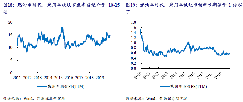 在燃油车时代,乘用车板块对应的是一般制造业的估值水平。传统燃油车时代,汽车产业已趋于成熟、成长性不高,且盈利能力相对偏低,因此乘用车板块享受的是制造业的一般估值。具体来看,2011 年以来,乘用车板块的市盈率普遍介于 10-15 倍之间,市销率则长期处于 1 倍以下。