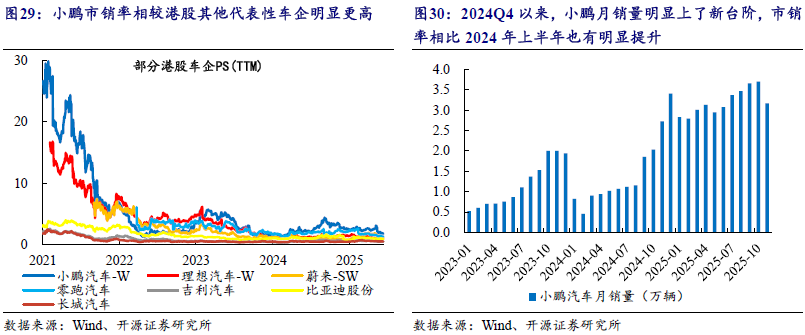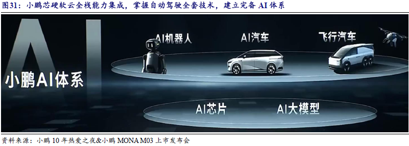 以特斯拉为对标标杆,小鹏在自动驾驶、机器人、飞行汽车、AI 芯片、大模型等领域进行了全维度布局,成为国内车企中科技属性最强的企业之一。尤其是 2024 年第四季度以来,小鹏的月销量明显跃升至新的台阶,扎实的基本面为其估值提供了有效的支撑;后续增程式车型及全新车型的上市,还将进一步推动其销量增长。