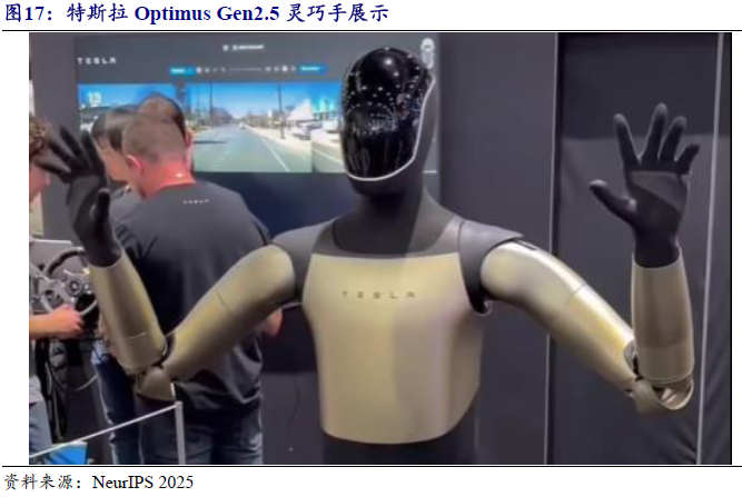 在硬件层面,灵巧手的设计是 Gen3(V3)实现拟人化的关键。其单手握有 22 个以上的自由度(22-DoF,我们预计最终方案会是 23-25DoF 单手),在关节数量、运动范围与力度控制上已接近甚至媲美人类手掌。部分手部执行器被后置到前臂上,这是模仿人类的手部结构 —— 因为控制人类手部的肌肉主要位于前臂。Gen3(V3)的每条手臂至少会配备约 26 个执行器,使其灵活程度与人类相当。这意味着 Gen3(V3)能够精准执行诸如握持不同形状的工具、操作精密仪器、完成穿针引线等高度精细化的任务。手部的灵巧化是人形机器人得以进入制造业装配、家庭服务、医疗辅助等广阔场景的基础,特斯拉在灵巧手领域的突破具有里程碑意义。